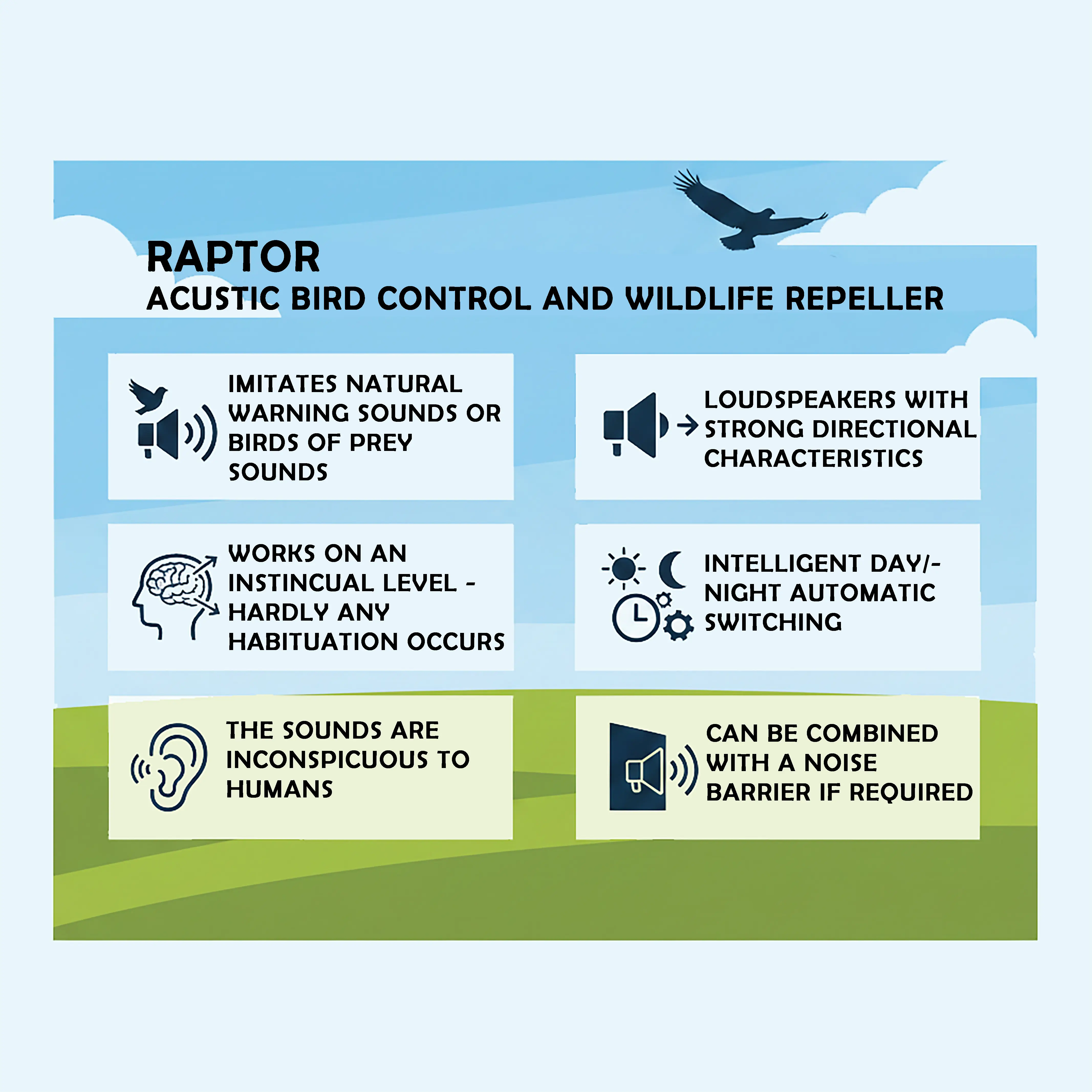 The high degree of effectiveness of the RAPTOR is due to the acoustic imitation of natural predators. The system uses a rotating random sequence of six to eight sounds from nature that the birds and other animals instinctively associate with danger. As a rule, when the animals hear these sounds they stay away from the protected areas.